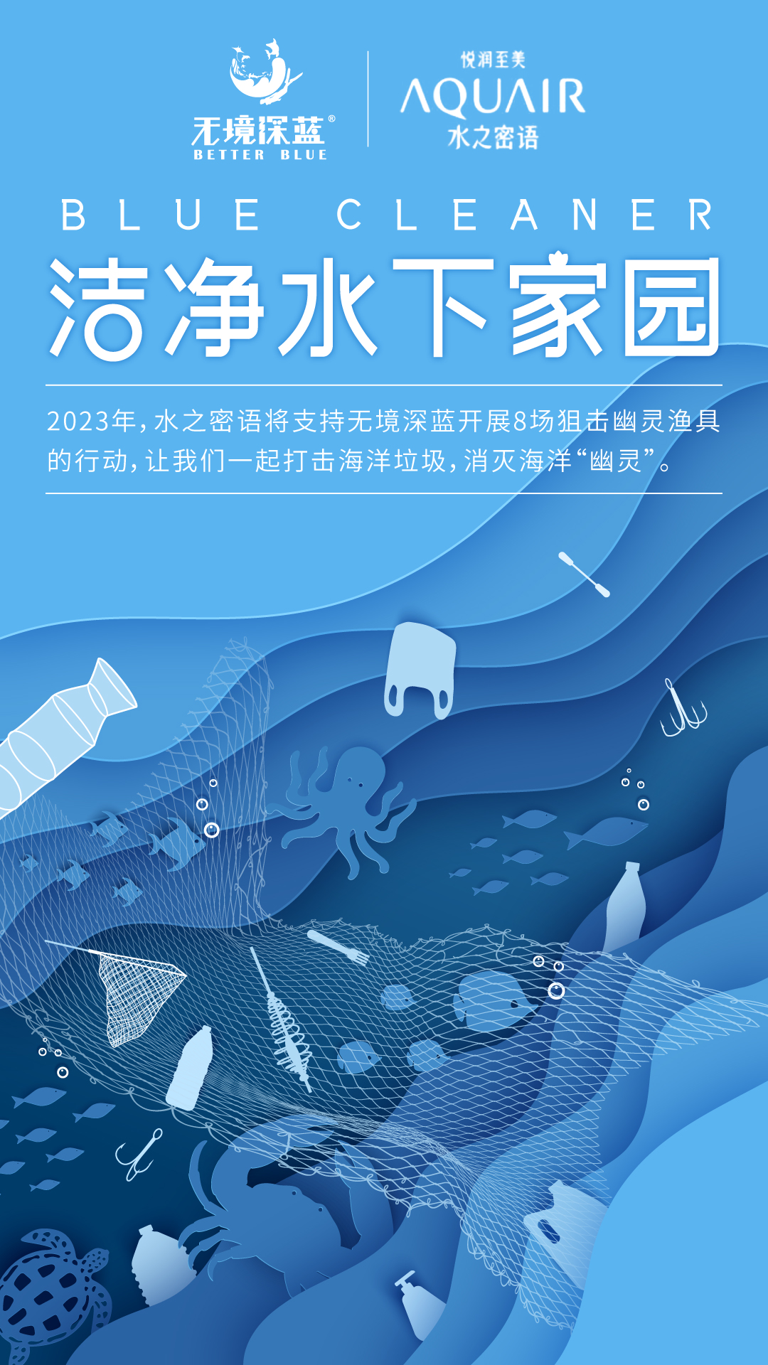 2021年开始,水之密语与国内知名海洋保护机构——无境深蓝合作,先后开展了认领潜点、清理海滩、认养珊瑚礁盘等专项行动,并共同探索保护海洋的更多思路与方法,用一致行动助力海水净化。今年,除了延续此前的净海项目,水之密语将与专业的潜水员团队合作,计划开展8场深海“幽灵渔网”狙击行动,助力大海“自由呼吸”,让美丽的海洋重新换发活力。